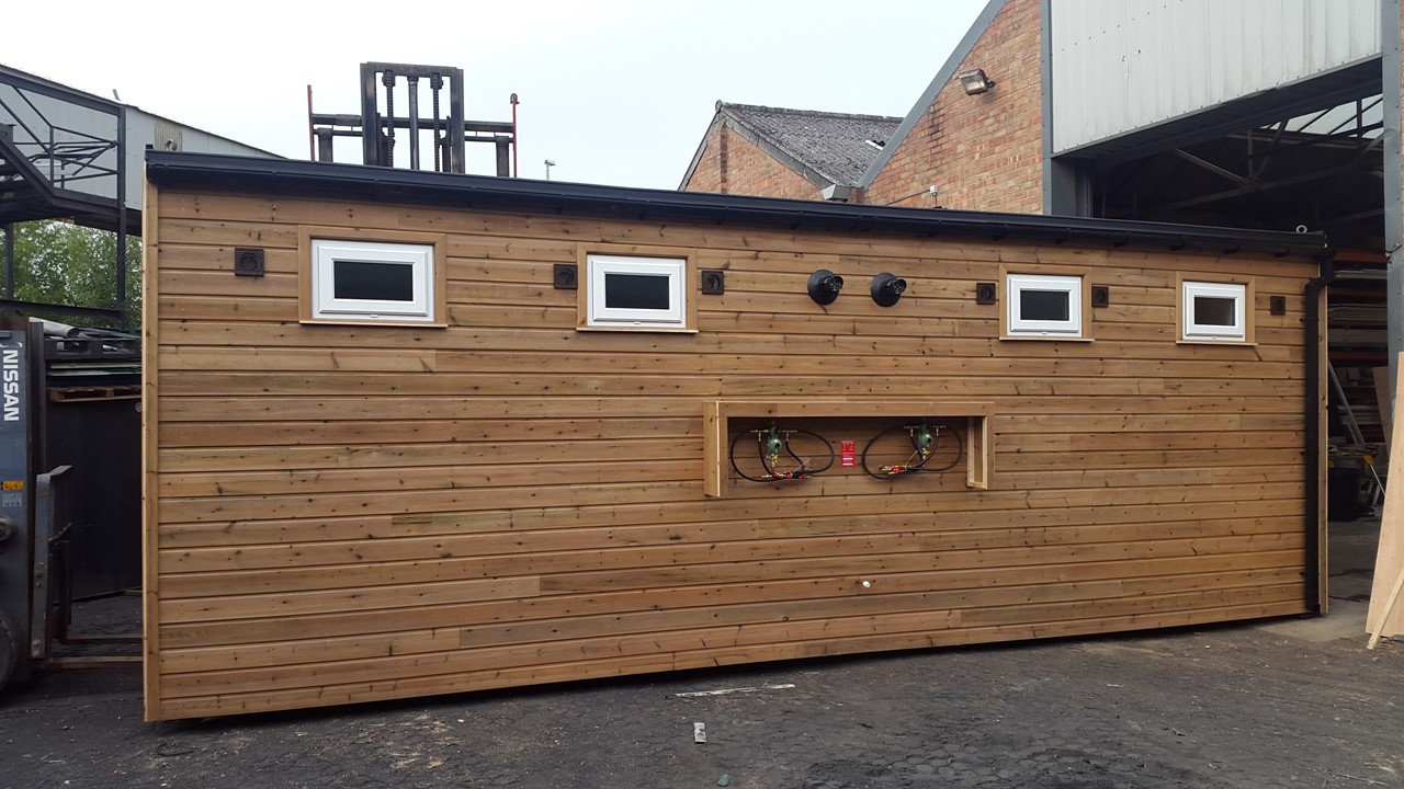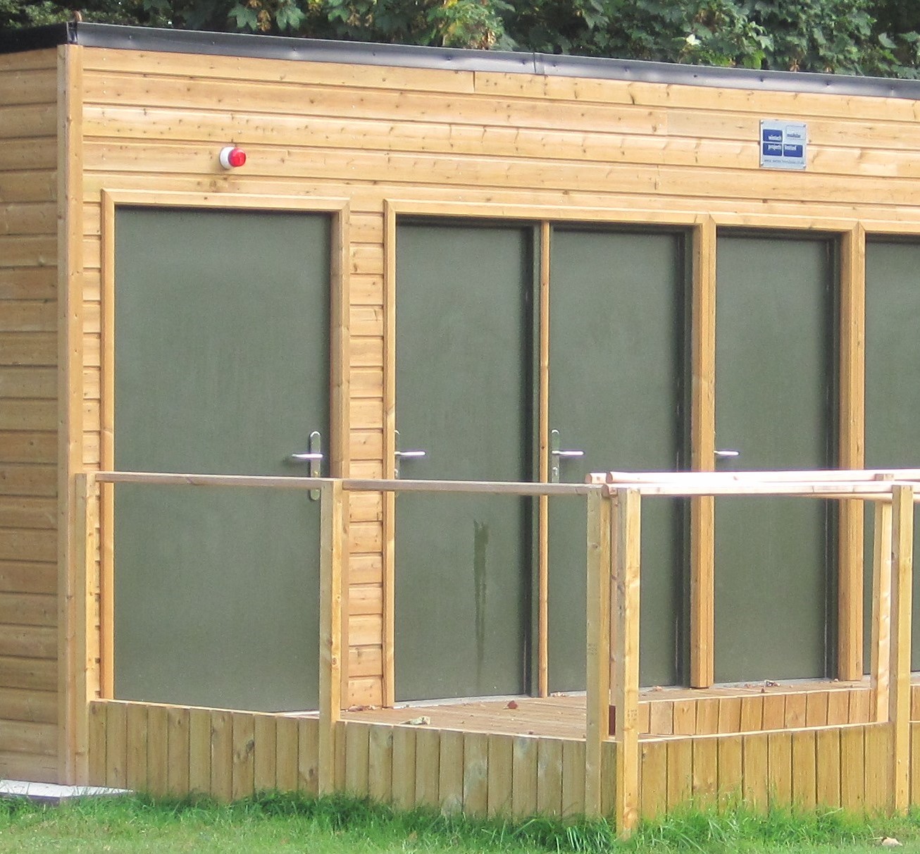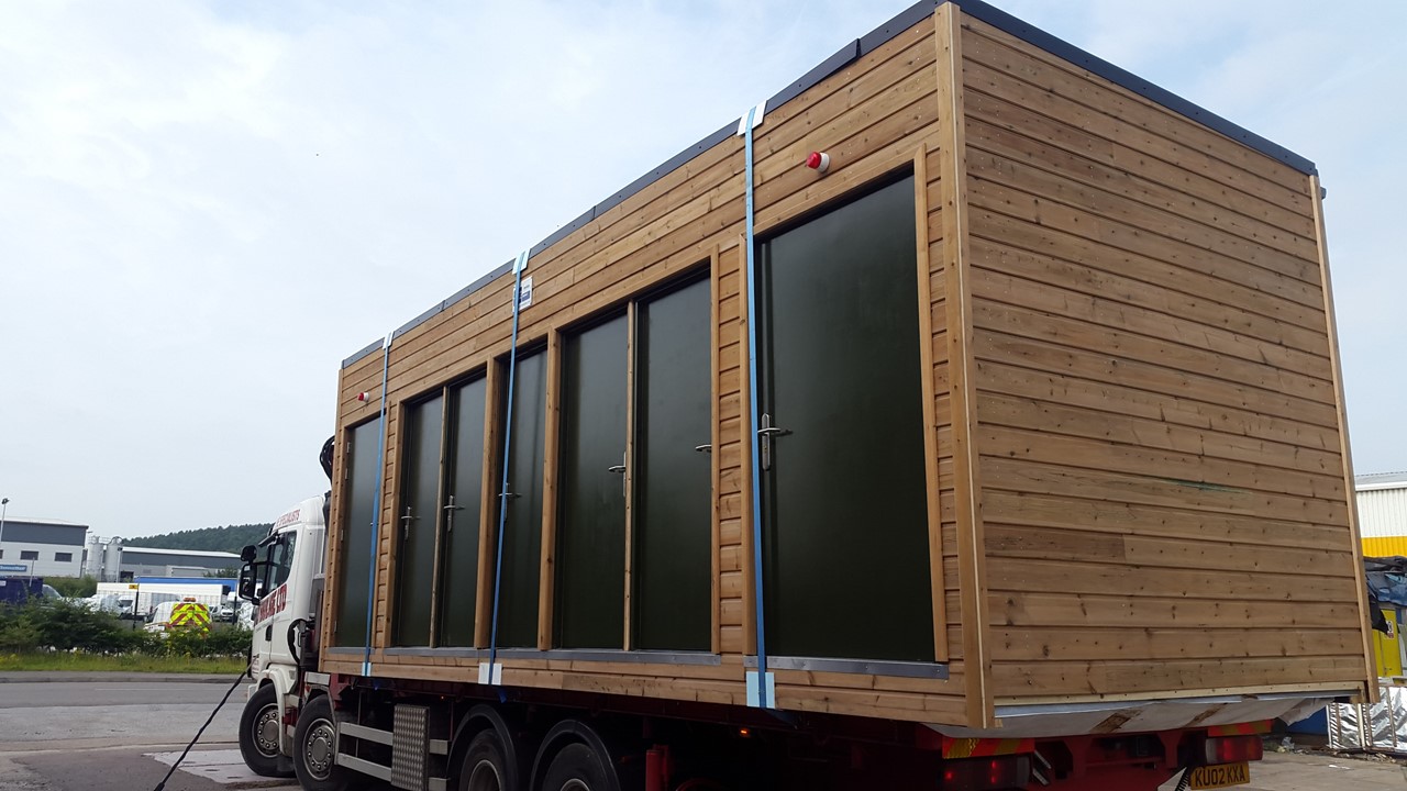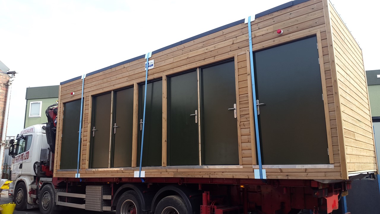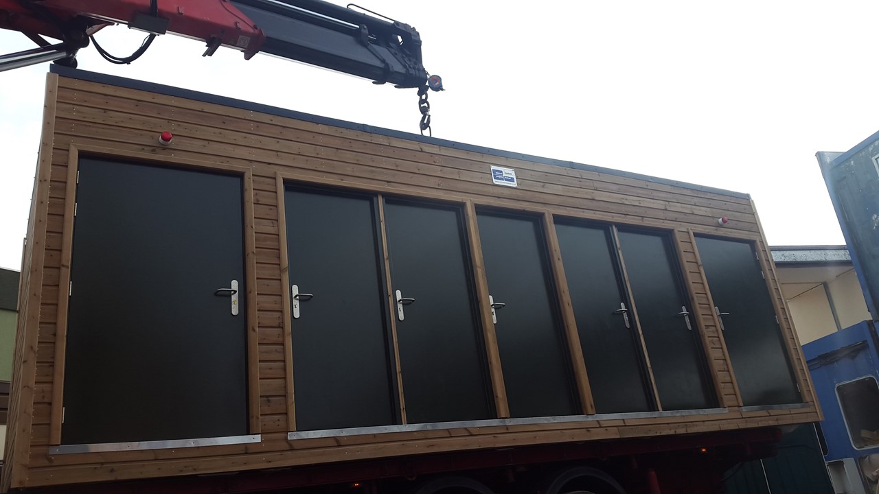 We created Haubois Activity Centre a portable shower unit with the dimensions 8.1 x 2.9m (27 x 9.5ft). The portable shower unit has  2 accessible cubicles and 4 standard shower cubicles. The units exterior face is clad with Norclad T&G timber with personnel doors to each cubicle.