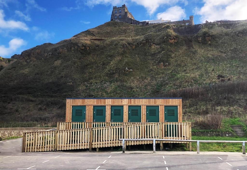 Our brief was to supply a block with 5 unisex toilets and a disabled toilet with heated washroom facilities to Scarborough Borough Council.
